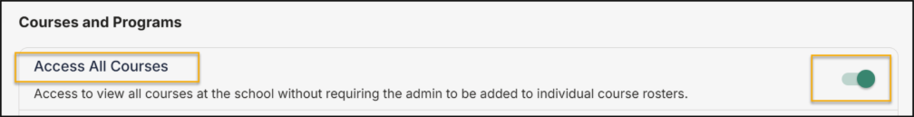 - Access All Courses toggle: Grant or remove system-wide course visibility for designated admins.