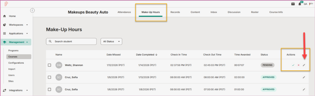 Administrators and instructors who review and manage student-led makeup time entries.