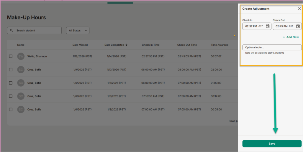 - Authorized staff can edit student-led makeup time entries after submission