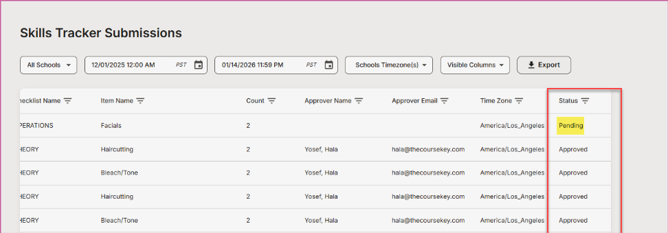 By surfacing pending items alongside approved skills, staff can quickly spot what needs attention, prioritize reviews, and keep students moving forward.