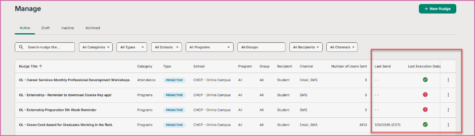 These columns provide instant visibility into nudge health, making it easier to spot failures, confirm successful runs, and take action quickly.