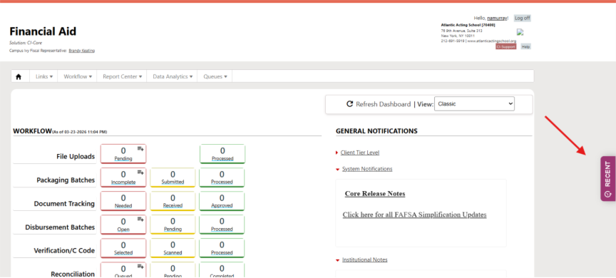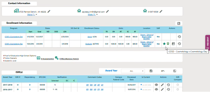 Student Record “Recent” Quick Access Dropdown